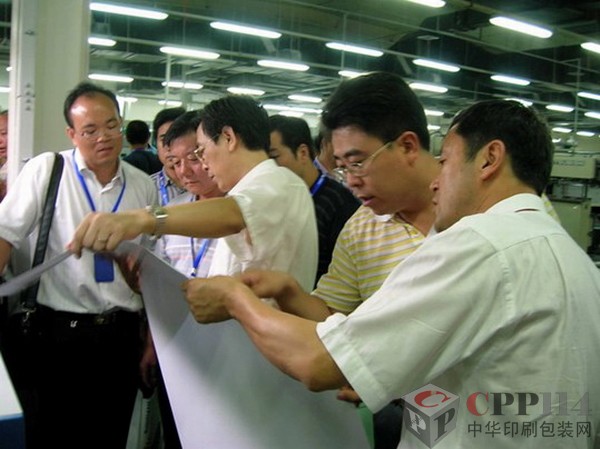 圖七:參會(huì)嘉賓在天津市匯源印刷有限公司參加高寶利必達(dá)105U現(xiàn)場(chǎng)演示紫外及復(fù)合技術(shù))