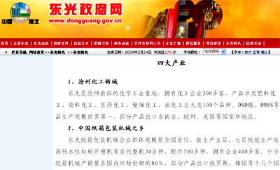 東光政府網對“中國紙箱包裝機械之鄉”(當地四大產業)的介紹