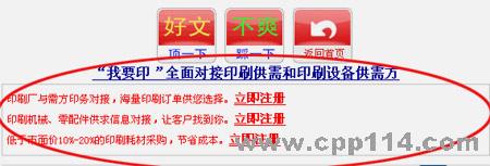 2) 資訊終極頁“右側互動欄”最上方提供了“我要印”旗下三個網站的功能(網站)模塊,方便印刷供需方、印刷設備及耗材制造商快速找到“供需點入口”,包括:(CPP114會員)免費注冊;(CPP114)會員升級;我要印;我的耗材;我要采購;在線洽談;發布產品;發布求購。