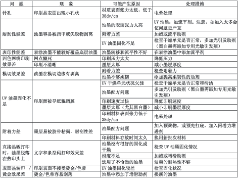 透明塑料盒的印材為各種塑料片材(如PVC,PET,PP等)。針對此類低表面能的塑料膠片材進行印刷,就各種印刷方式中UV墨印刷常見的共性問題做一分析(見表1)。