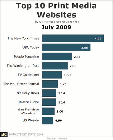 - 據(jù)國外媒體報道,美國互聯(lián)網(wǎng)流量監(jiān)測機(jī)構(gòu)Hitwise發(fā)布了7月份美國印刷媒體網(wǎng)站流量排名,排名前三的美國印刷媒體網(wǎng)站分別是The New York Times、USA Today及People Magazine。這三家網(wǎng)站分別占4.93%、3.86%和2.37%的市場份額。
