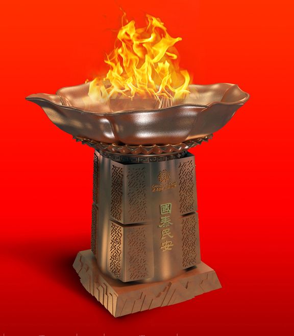 圣火臺底座為方形,并由山形紋四面圍合而成,寓意圣火臺穩如泰山,亦取天圓地方之“地方”和“國泰民安”之意。圣火臺總高110cm,意指第11屆全運會;點火盆與柱體銜接部位有34朵荷花瓣,“荷”與“和”諧音,寓意34個省市自治區和直轄市和諧共進;圣火臺上部圓周表面飾有56個回紋,象征華夏56個民族團結在一起。