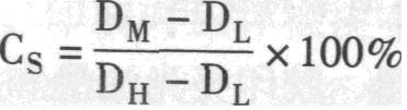用彩色密度計由R、G、B三色濾色片對一原色油墨的實地色塊進行測量,將會得到大、中、小三個數值,分別用DH、DM、DL表示,用下面的公式計算油墨的色偏cs:色偏越小,油墨色相越純正,理想的三原色油墨的色偏為0。(圖1)