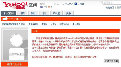 因運營策略的調整,雅虎空間將于2009年10月30日正式停止服務,請您在此日期前就您空間博客、相冊、評論的個人資料和相關內容以下述方式進行充分留存備份,也請您方便時通知您空間的好友并與好友保持聯系。屆時雅虎空間將不再留存您的任何個人資料和相關內容。