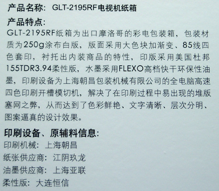 水印瓦楞紙箱類銀獎:GLT-2195RF電視機機箱
