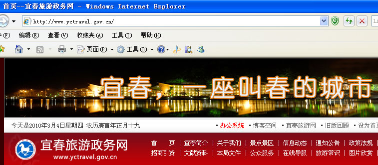 【CPP114】訊:最近,由宜春市旅游局主辦的宜春市旅游政務網和宜春旅游網,都在網站首頁最上方,以頭條通欄或頭條橫幅的形式,打出了宜春旅游2010年的廣告語:“宜春,一座叫春的城市。”這一做法,很是引人注目。在互聯網眾多的論壇、博客里,網友們都在拿它說事。有的說:“宜春旅游政務網,超級有才。”也有的說“宜春政府太有才了,居然會叫春——這叫蠢。”還有網友把這一廣告語稱為“虎年雷人標語”、“2010年史上最牛、最雷人的政務網廣告語”……