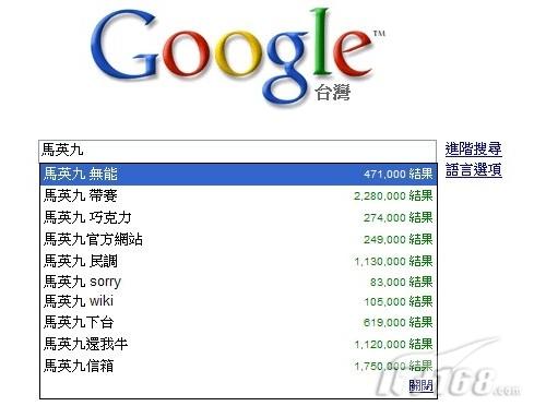 2、“Google臺灣”輸入“馬英九”彈出“無能”