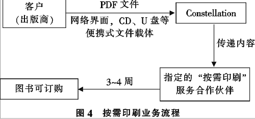 Constellation的按需印刷業務適用于普通平裝書和精裝書,一般適用范圍是12個月內銷售量小于120本的圖書。目前,其合作伙伴是書浪公司(Booksurge)和閃電資源公司(Lighting Source)。該業務的工作流程如圖4。