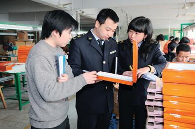 ④ 義烏檢驗檢疫局工作人員在木制工藝包裝禮品企業現場指導