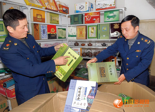 - 潯陽區工商局白水湖分局對京九大市場的12戶茶葉經銷商進行了突擊檢查,有7戶存在使用假冒“廬山云霧茶”包裝物的行為,執法人員當場收繳3200個包裝盒。