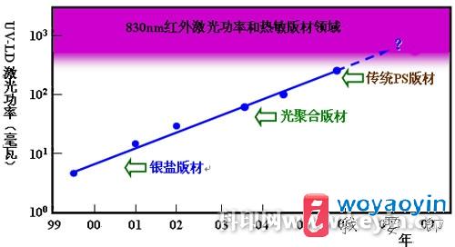 由于上述的技術(shù)原因,滿足高速成像和已有激光器發(fā)光波長匹配的要求成為早期直接制版首先需要解決的技術(shù)問題,所以歷史上首先登臺的是光敏直接制版技術(shù),并成為1996年及以前市場的主流技術(shù)。當時使用的是倍頻的YAG激光(632nm)或氬離子激光(488nm)和銀鹽直接版材(包括銀鹽與PS版結(jié)合的版材)。不過,這種狀況很快就被高功率、性能穩(wěn)定的半導體紅外激光器(即,所謂的IR-LD,發(fā)光波長為830nm,功率高達數(shù)百毫瓦~數(shù)瓦)和配套的多光束掃描成像技術(shù)(如行業(yè)法規(guī),光柵光閥技術(shù):GLV)的出現(xiàn)打破,大約從1997年開始,采用830nm紅外激光光源的熱敏直接制版技術(shù)迅速成為直接制版技術(shù)的主流,市場占有率超過了光敏直接制版技術(shù),這種狀況一直延續(xù)到今天。高功率的830nm紅外激光器和配套的多光束掃描技術(shù)掩蓋了熱敏成像低敏感度的缺點,突出了其優(yōu)秀的二值影像和操作性能,這是熱敏直接版材成為市場主流的最重要原因。但是,上世紀90年代末期出現(xiàn)的半導體紫激光器(即所謂的UV-LD)為這個趨勢添加了另外一個制衡因素,因為UV-LD也屬于基于半導體技術(shù)的固體激光器,具有半導體激光的所有優(yōu)點,而且發(fā)光波長在藍紫光范圍(發(fā)光波長一般在390~410nm,典型波長為405nm),成像材料開發(fā)相對容易(傳統(tǒng)的PS版材也在這個范圍敏感)。UV-LD剛出現(xiàn)時功率非常低,只有數(shù)毫瓦的水平,僅僅滿足銀鹽版材的掃描成像要求;到2003年左右功率已經(jīng)提升到數(shù)十毫瓦的水平,適合于包括光聚合版材在內(nèi)的掃描成像要求;到2006年左右功率已經(jīng)提高到超過100毫瓦,甚至傳統(tǒng)PS版材也滿足了直接掃描成像的要求。圖3是從目前相關(guān)報道中摘取的UV-LD激光器功率(對數(shù))與時間的關(guān)系圖,功率的對數(shù)值與時間呈明顯的顯性關(guān)系,進入830nm半導體紅外激光器的功率范圍也許只是一個時間問題(如虛線剪頭所示),盡管還需要相應(yīng)的數(shù)據(jù)來考證,但其功率已經(jīng)提高到甚至滿足傳統(tǒng)PS版成像要求具有非常現(xiàn)實和重要的意義。這一事實的另外一個解釋就是,傳統(tǒng)的PS版在感色范圍和敏感度上已基本滿足UV-LD直接掃描成像的要求,隨著UV-LD激光器功率的進一步提高,也許在不遠的將來完全有可能成為一種主流的直接版材。對我國廣大的PS版材生產(chǎn)企業(yè)而言,提高PS版敏感度和性能的穩(wěn)定性具有非常重要的意義,會使PS版材的壽命得到延續(xù),在CTP技術(shù)時代也可以找到自身的位置,繼續(xù)發(fā)揮作用。不管是光敏還是熱敏直接版材技術(shù)都經(jīng)過了相似的發(fā)展歷程,具有相近的發(fā)展目標,從顯影前需要烤版(預熱)的第一代版材,發(fā)展到顯影前不需要烤版的第二代版材,目前正在向免化學處理">免化學處理的第三代(即,顯影等后處理不需要使用化學試劑,使用中性水即可)和免后處理的第四代(激光掃描成像后無需任何后處理即可使用的版材)的方向發(fā)展,即,向操作更加簡便、更加環(huán)保的方向發(fā)展。