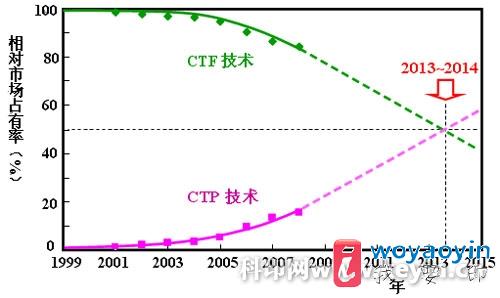 圖5 CTP技術(shù)和CTF技術(shù)的相對市場占有率和發(fā)展預(yù)測