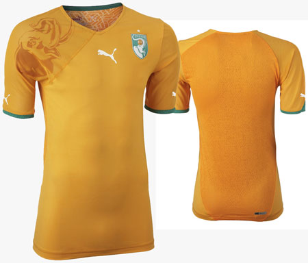 科特迪瓦國家隊新款主場球衣依舊延續了橙色的傳統,右肩上巨大的大象暗紋是科特迪瓦的象征,新球衣左側胸口的隊徽也做了修改,從新賽季開始,科特迪瓦足協不再使用以往以版圖為輪廓的徽標而改成了盾牌。