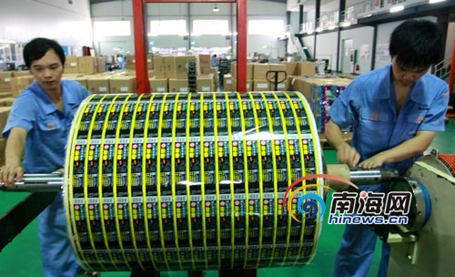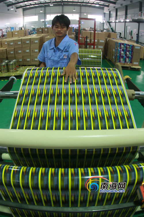 海南現代包裝工業園廠房里,工人在裝包裝卷膜
