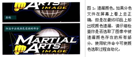 解決方法:使用宏指令幫助完成矢量圖中的顏色轉換和替代。宏指令迅速選取顏色相同的每一個圖像部分。一些軟件如Illustrator允許選取圖案中的相似顏色部分,從而簡化了分色工作。corelDRAW有一個尋找/替換顏色的宏指令,可幫助選取所有的色塊;此外它還有一個打印預覽的功能,可在出片之前對每一個陽圖文件進行詳細檢查。將設計原稿與陽圖文件比較,可找出存在的任何問題。