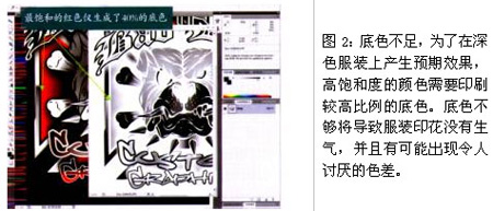 這個問題之所以特別棘手,是因為需要一些遠見才能發現它。解決該問題的技巧在于要了解所使用的油墨,并且清楚在一件深色襯衣上完成一幅明亮的印品真正需要多少底色,同時襯衣的色調不會影響疊印顏色或者數值。一個導致深色襯衣上底色不夠的常見原因與創建底色的方法有關。