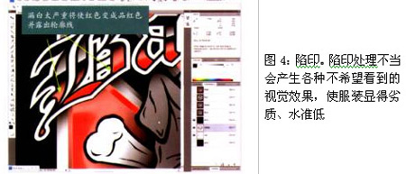 解決方法:進行圖像測試,了解對于不同狀況和不同服裝顏色需要多少陷印量,這種方法將解決陷印問題。一旦有問題出現就認真加以記錄,以便在下次處理相似活件時,設計部門將有一個可依據的標準,從而能夠在圖像上進行正確的陷印處理。不過最令人抓狂的是,有些圖像在一些服裝如麻灰色襯衣上無須陷印,但在其他顏色的服裝上印刷時又需要進行陷印處理。陷印量不足的問題在白色襯衣上會更加明顯。在這些情況下,建立陷印標準不僅有利于解決眼下的問題,而且還為處理將來某個時候出現的任何問題做好準備。