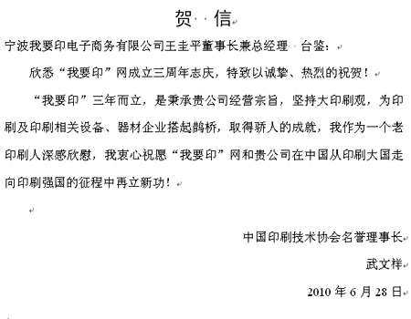 【CPP114】訊:編者按:2010年7月1日,“我要印”網將迎來3周歲生日。中國印刷技術協會名譽理事長武文祥特為此發來賀信。題目為 編者所加。