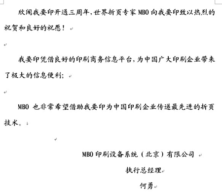 【CPP114】訊:編者按:2010年7月1日,“我要印”網將迎來3周歲生日。MBO印刷設備系統(北京)有限公司執行總經理何勇為此發來賀信。題目為編者所加。