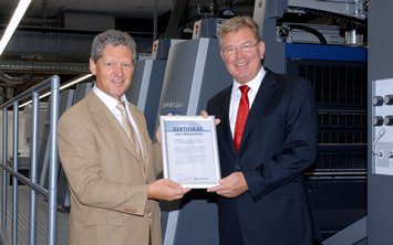 UD印刷公司經(jīng)理Ulrich Bigler(左)從海德堡瑞士Urs Saner副理手中接過速霸XLl05氣候保護證書