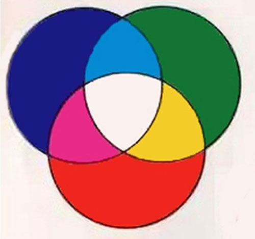以上各式表明,色光的相加(混合)所獲得的新色光其亮度增加,故稱色光的混合為加色法。改變三原色光中任意兩種或三種色光的混合比例,可以得到各種不同顏色的色光。光是作用于人眼并引起明亮視覺的電磁輻射,具有能量,色光混合的數量愈多,光能量和值愈大,形成的色光愈明亮。