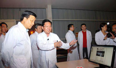隨后,在滕廠長的陪同下,劉云山部長一行又走進生產線中控室,通過電腦屏幕觀看生產線運行狀況。當聽到這條生產線及控制系統是由二膠人自己設計而且現代化程度比較高時,劉云山部長再次以微笑的方式表示贊賞。