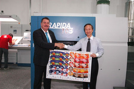 德國高寶公司單張部市場總監Juergen Veil先生與深圳藍恒信紙品有限公司總經理陳海舟先生合影并展示利必達105-6+UV印刷機現場印制的精美樣張