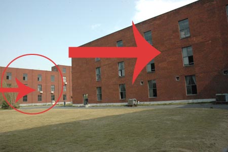 左邊圈紅處為員工宿舍,外裝有空調;右紅箭頭為印刷車間