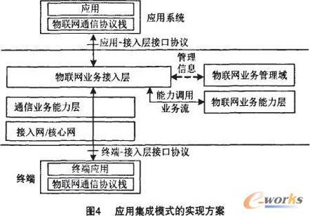 運(yùn)營(yíng)商提供的端到端物聯(lián)網(wǎng)應(yīng)用開(kāi)發(fā)、集成、運(yùn)營(yíng)和維護(hù)服務(wù),終端和應(yīng)用系統(tǒng)采用運(yùn)營(yíng)商定義的物聯(lián)網(wǎng)通信協(xié)議,接受物聯(lián)網(wǎng)業(yè)務(wù)管理域的運(yùn)營(yíng)和管理,該模式下可以同時(shí)選擇使用增強(qiáng)通道。其實(shí)現(xiàn)方案如圖4所示。