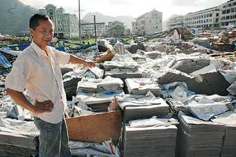 這里的人們對臺風似乎已經習慣了,但是沒有哪一次像“桑美”這樣給小鎮帶來如此大的災難。從蒼南縣城乘車前往金鄉鎮,筆者在沿途看到,到處是瓦片被吹走的民房,水泥電線桿被攔腰截斷,一些直徑幾十厘米的大樹被連根拔起。人們趁著臺風過后的晴好天氣在戶外晾曬淋濕的衣服、被褥,工程隊忙著在搶修屋頂。受損的企業也正在積極組織員工清理受災現場,一些動作較快的企業已經開始打樁,準備重建廠房。