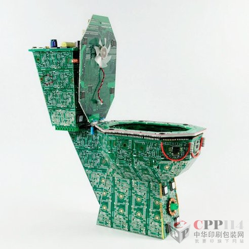【CPP114】訊:據國外媒體報道,電子科技讓給我們的生活帶來了翻天覆地的變化,而電子垃圾對地球環境的危害也日益突出。隨著環保意識的增強,人們盡可能低的減少這些高科技電子產品帶來的廢品污染問題等,設計師Steven Rodrig就致力于將這些廢棄的印刷電路板制作成各種生活用品,例如這款這款有創意的馬桶。