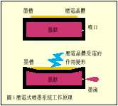 圖5是壓電噴墨系統的原理圖。在其噴頭上有塊壓電晶體,在電流的作用下,壓電晶體變形彎曲,使墨腔的體積減小,壓迫墨腔,把墨滴經噴嘴壓出,到達承印物上。什么時候產生電流讓壓電晶體彎曲,由計算機控制。壓電噴墨系統不會產生墨滴飛濺,并且既可以使用水基也可以使用溶劑型油墨。一般壓電噴墨系統使用臘狀油墨,油墨在加熱到半固體狀態噴射到網版上,油墨接觸網版后立即干燥。