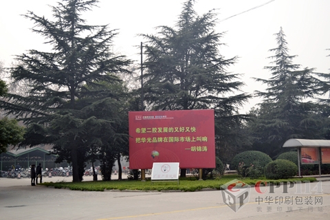 進入樂凱華光園區,抬頭可見胡錦濤主席的題詞——“新聞二膠發展的又好又快,把華光品牌在國際市場上叫響。”