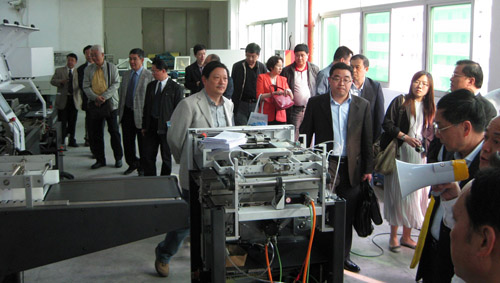 在精密達數字化書刊按需印后設備車間,與會嘉賓觀看DIGITAL ROBOT(數碼機器人)2000B設備的組裝現場。亞洲第一條數碼按需印刷(POD)全連線設備已于2011年11月份在南京鳳凰出版集團啟用,該連線的印后解決方案就是由精密達公司提供的DIGITAL ROBOT(數碼機器人)2000B設備。
