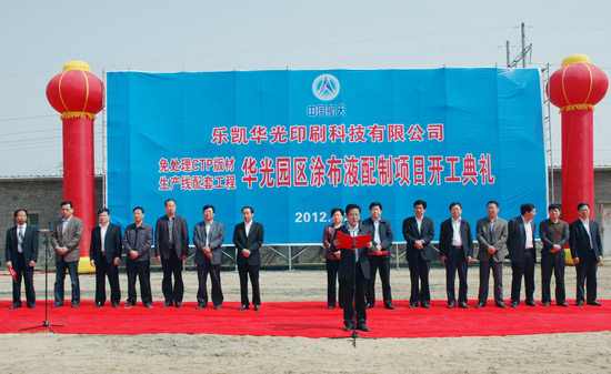 - 4月27日上午,華光園區西北角的空地上彩球高懸,彩旗飄揚,人頭攢動,河南省2012年第一批重大建設項目——樂凱華光印刷科技有限公司免處理CTP版生產線配套項目涂布液配制車間開工典禮在這里隆重舉行。