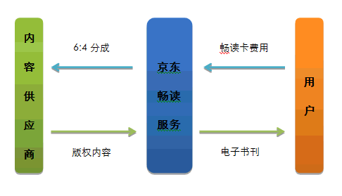京東暢讀卡服務的商業模式主要通過打包的方式將內容供應商提供的電子書刊以相對低廉的價格銷售給用戶,再將收入所得按照點擊次數與內容供應商進行分成。