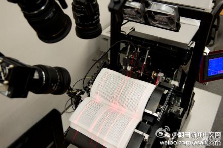 該裝置的原理是:機器自動翻頁,同時紅外線激光捕捉翻頁時紙張生成的形狀,選出最清晰的瞬間后快速拍照。儀器對圖像進行修正處理后,記錄成平面形式。