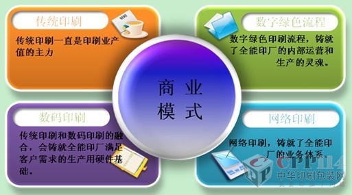 一個完善的全能印廠是由5大部分組成的:傳統印刷,數碼印刷,數字綠色印刷流程,網絡印刷,商業模式,這五大核心因素也構成了全能印廠的核心競爭力。核心目的就是獲取持續增長的業務量,更直接地講就是擴大客戶群和保證客戶的持續購買力。那么,如何對全能印廠的五大核心競爭力進行有機組合呢?