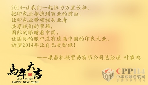 印刷如此多嬌,令印藝探索永無止境。值此辭舊迎新之際,我要印旗下中華印刷包裝網特舉辦“2014新春賀歲新春寄語”大型網絡專題,康鼎機械貿易有限公司總經理葉霖鴻先生向行業發來新春寄語。祝福原文如下: