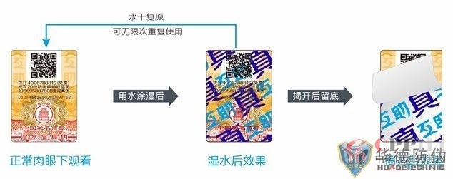 用水、白酒等無色液體浸濕標識表面,可快速顯示“互助、真”字樣,水干復原,可無限次重復鑒別,技術獨有,不可仿制。