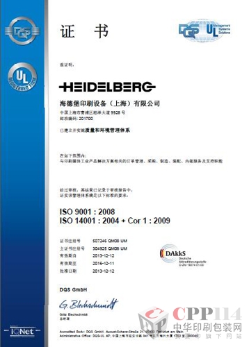 【CPP114】訊:位于中國上海青浦工業區的海德堡印刷設備(上海)有限公司( 以下簡稱海德堡青浦工廠)近日成功通過國際認證機構DQS關于ISO 9001質量管理體系和ISO 14001環境管理體系的國際權威認證。這兩項認證與海德堡德國總部所獲得的認證完全相同,均由德國權威認證機構DQS經過預審、正式審核后頒發,標志著海德堡青浦工廠已完全具備與德國總部相當的質量管理水平,并承諾保護環境,承擔應有的社會責任。