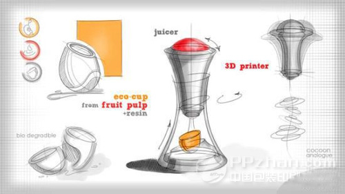- 現在已經出現了一種名叫PriO的新機器,它將榨汁機與3D打印機巧妙的融合到了一起,在我們享用美味果汁的同時,還可以將水果殘渣作為3D打印的原材料加以利用,變成我們日常生活使用的水杯或盤子等工具,避免了這相當大一部分的浪費。