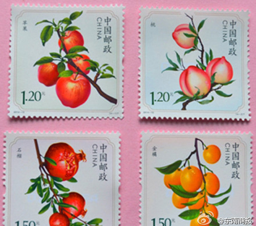本月15日,中國郵政發行了《水果(一)》特種郵票,全套共4枚。據了解,《水果(一)》郵票圖案分別為蘋果(1.20元)、桃(1.20元)、石榴(1.50元)、金橘(1.50元)。