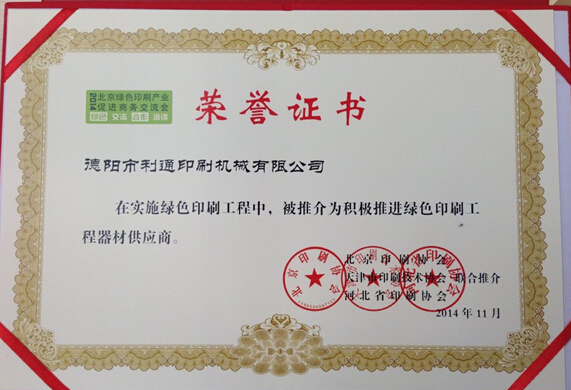 德陽利通獲“積極推進(jìn)綠色印刷工程器材供應(yīng)商”稱號(hào)