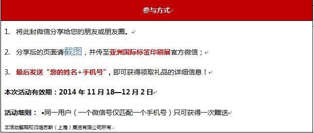 只要您關注亞洲國際標簽印刷展官方微信(微信號:labelexpo_Asia),并轉發此條內容到朋友圈,即可收到主辦方送出的小禮物。