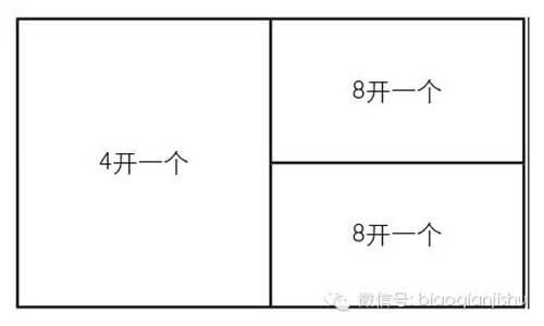 再如,有2個品種的產品,使用70g/m2的雙膠紙印刷,成品的規格不同,其中正度4開規格的產品印刷100張,正度8開規格的產品印刷150張。這樣小批量的訂單,拼版印刷會多用紙張,但比增加印版合算。因此,可以考慮在對開的幅面里合拼4開1個和8開2個的版面,拼版樣見圖4所示。