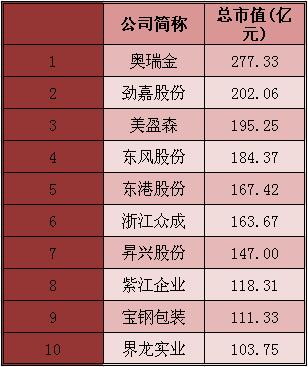 - 2015年中國包裝印刷業上市公司市值前十名排行榜出爐,榜單的前三名依次為奧瑞金、勁嘉股份和美盈森。