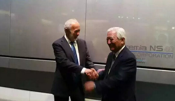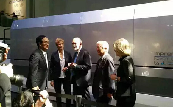 Drupa2016,繼drupa2012后第二次小森公司社長小森善治和班尼·蘭達握手。不同于drupa 2012的概念展示,本次展會小森推出采用Landa納米墨水的小森Impremia NS40數字噴墨印刷機,并進行現場印刷演示。