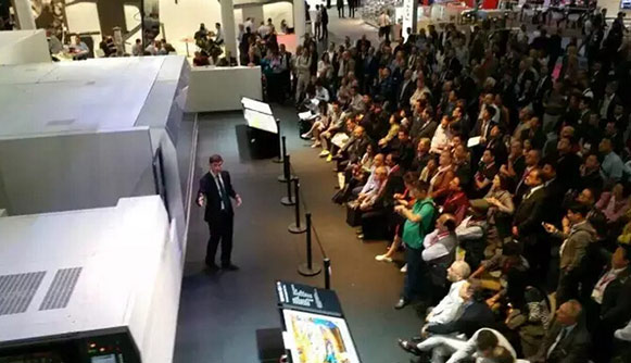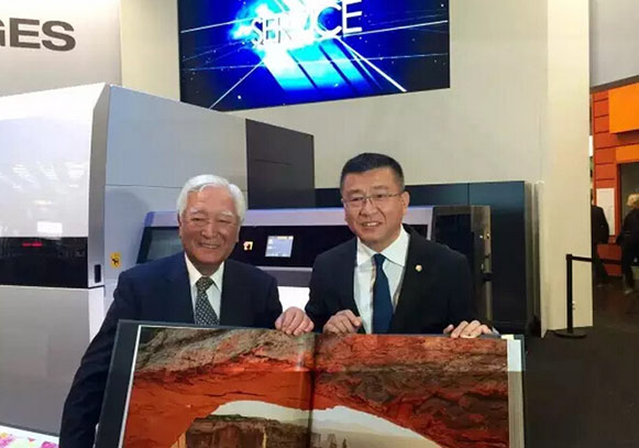 小森公司社長(zhǎng)小森善治與雅昌文化董事長(zhǎng)萬(wàn)捷同框,老友相聚,共同開啟新篇章。并相互攜手,為首場(chǎng)小森NS40蘭達(dá)納米噴墨展示帶來(lái)超高人氣!