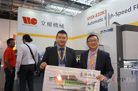 “這次展會,我們覺得機器最終是服務于人的,所以我們展位的設計及樣張的設計都希望有人文的訴求,所以你可以看到我們的樣張是兩條活靈活現的鮭魚,在這條大鮭魚的脊背上容納了臺灣本島精選的52個景點,包括臺灣的101大樓、最高的山岳玉山等等,小鮭魚的脊背上的圖案則是蘭嶼,這是藝術家”蠟筆王“的作品,展會上我們的樣張也非常受歐美企業的歡迎。”